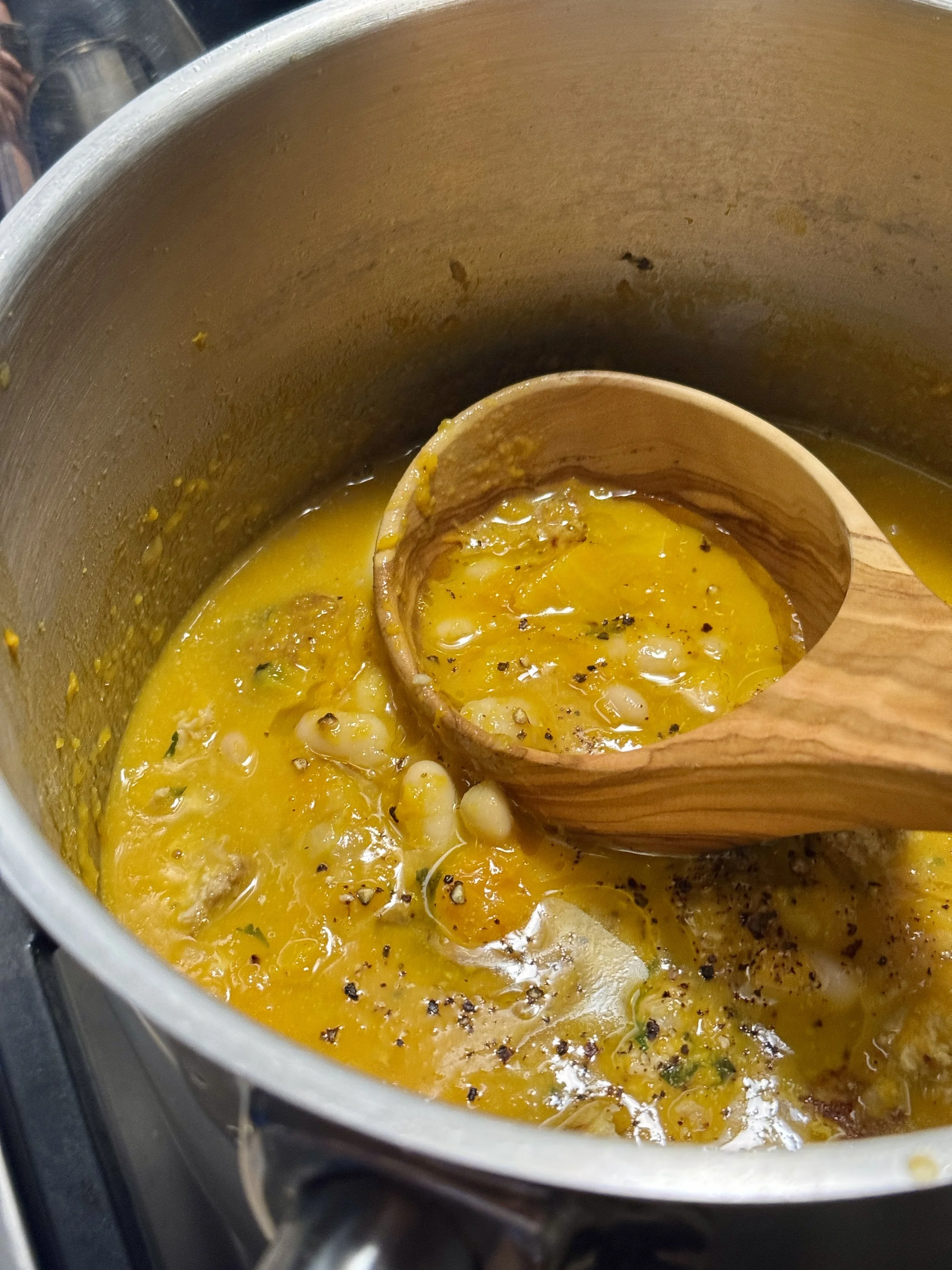 Honeynut pumpkin, sausage and white bean soup … and the best ladle, a gift from Clare.
